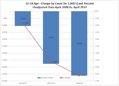 Since April 2008, the population in age group 25-54 declined 0.8%, but the labor force declined 3.6%, and employment declined 4.6%.