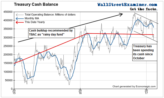 The apparent decline in the monetary base over the past 2 years was driven by shifts from two line items on the Fed’s balance sheet, not by any real shrinkage of money. First there was a massive buildup of the Treasury’s cash at the Fed as it sold more debt than it needed to from 2014 until late 2016. When investors and dealers bought the debt, that cash came from their bank accounts, moving from reserve deposits to Treasury deposits on the Fed’s balance sheet. By definition, the monetary base shrank, but in reality, all the money was still there, ready to circulate at a moment’s notice.