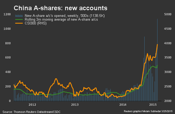 With property markets in trouble, China’s speculative investors are turning to equities. Moreover, increasing numbers of new investors are entering the markets. Last week we saw more than a million new A-share accounts opened, with brokerage firms having trouble keeping up.