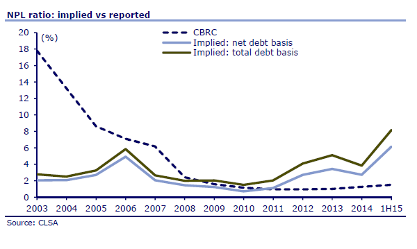 Yet another problem is that as commodity prices tumbles, as global trade slowed down, Chinese loan issuers have seen a massive surge in bad loans, if not officially, then certainly as tracked by unofficial sources. As we reported a month ago, China’s true NPL may be as high as 20%, a number suggesting up to $3 trillion in loans have gone bad and have to be written off. Even a far more conservative estimate by CLSA quantified China’s bad loans at 8.1%, five times greater than the official number and a key reason for China’s relentless deposit flight as local savers gradually realize a broad financial sector crisis is not only inevitable but just a matter of time.