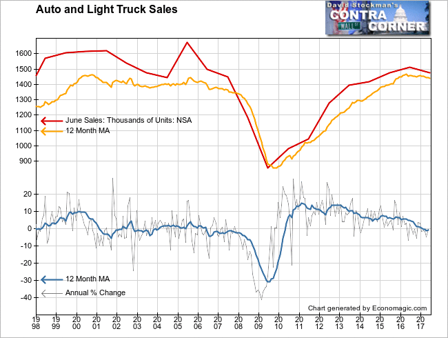 The mainstream media took note of weakening auto sales in June, a trend that we have been reporting on since last year. As usual the tendency of the financial infomercial media was to couch the weakness in positive terms, as exemplified by this headline from CNBC.com: