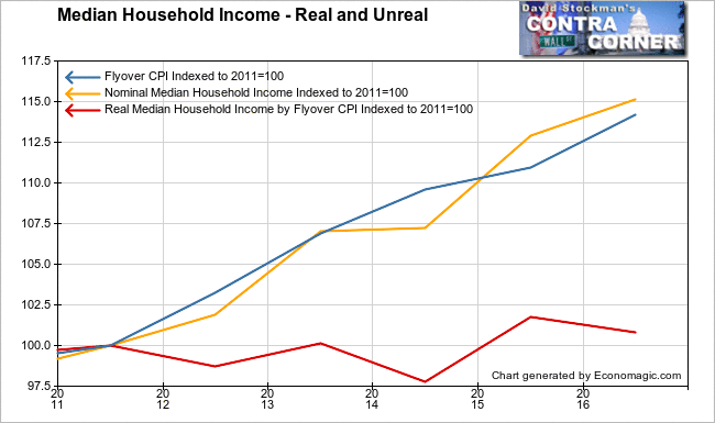I have used the Flyover CPI developed by David Stockman as the deflator. We have written at length about the Flyover CPI in past posts. The Flyover CPI differs from the official CPI in a couple of important ways. It counts actual house price inflation as opposed to the BLS’s phony construct of housing inflation called Owner’s Equivalent Rent. It also gives slightly higher weight to energy and medical costs.
