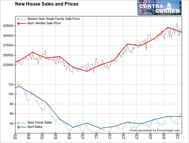 The current sales data shows that the slowdown has already begun. The April decline is unusual. Looking at the actual, NSA data, April is normally an up month. On average over the prior 10 years, sales have increased by 2.5% month to month in April. In April 2016 they were up by 1.9%. This year, April had a decline of 4.1%. On a year to year basis, sales had been running relatively flat, with an average year to year gain of 0.6% over the past 12 months. The current year to year drop of 5.4% is well outside the range of the past year. It suggests a change of trend. April’s sales were not only below last April’s, they were below April 2015 as well.