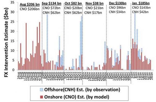 According to a Goldman report, so far in January “there has been around $USD 185bn of intervention (with the recent intervention predominantly taking place in the onshore market)” split roughly $143 billion on the domestic side and $42 billion on the offshore Yuan side.