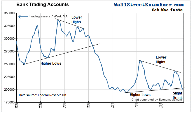 One of the most important indicators that can help you understand the market is the total value of bank trading accounts. The Fed tracks and reports this weekly. I have been charting and reporting it for years. At times this measure appears to give advance warning of trend changes in stocks and bonds.